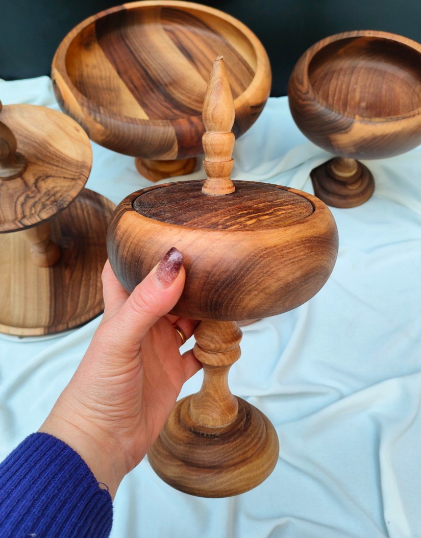 شکلات خوری کوچک گردو با پایه چوبی، یک انتخاب شیک و خاص برای تزئین میز پذیرایی شماست. با طراحی جذاب و کیفیت بالا، این محصول نه تنها محفظه مناسبی برای شکلاتهای خوشمزهتان است، بلکه به دکوراسیون منزل شما جلوهای منحصربهفرد میبخشد. این شکلات خوری ترکیبی از زیبایی و کارایی در کنار هم است.